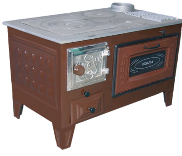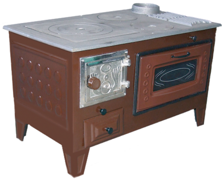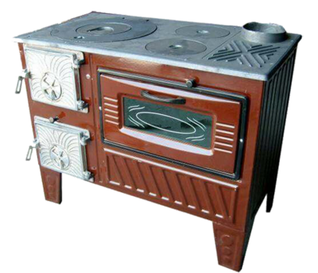 Стекло духового шкафа. Стекло камеры сгорания в печах ПВ 05С, 06. Камера сгорания чугунная, дополнительно защищена огнеупорным камнем. Зольник. Дожиг. Чугунная варочная поверхность. Три съёмных круга. Большое кольцо состоит из наборных колец, максимальный диаметр 300 мм. Два малых кольца диаметр 170 мм. Зона для разогрева пищи. Дверцы топки в печах ПВ 01, 03, 04, 05 сделаны из чугуна. Полка для сушки дров в печах ПВ 05 и ПВ 05С. Духовой шкаф защищён от попадания дыма. Обдув духовки регулируется перекрытием внутренних каналов дымохода. Температура выпекания в духовом шкафу регулируется, стандартная 180 градусов, максимальная до 320 градусов.