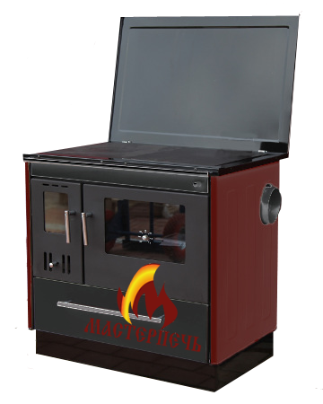 Варочная панель из обожженной стали. Обдув стекла камеры сгорания, антипригар. Нижний ящик для дров или посуды.